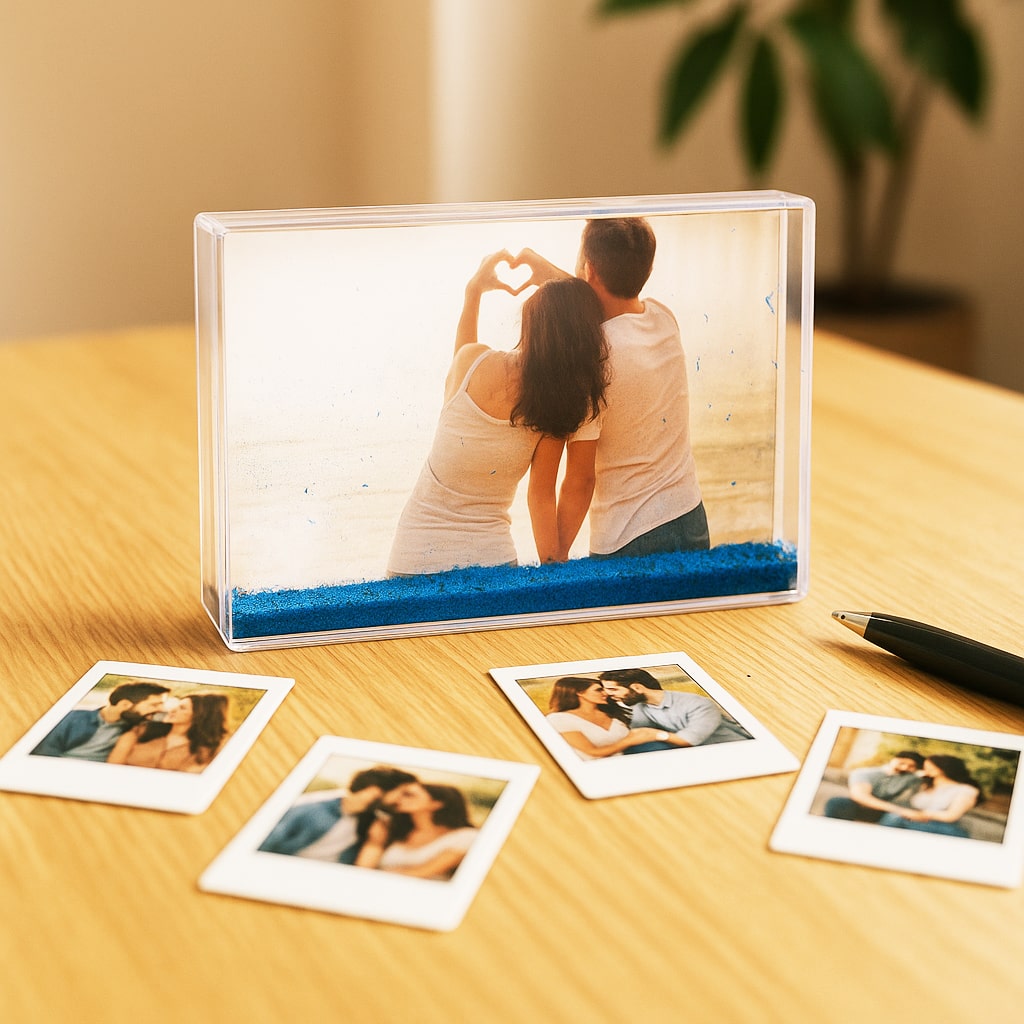 10x15 Işıltılı Masaüstü Çerçeve, sevdiklerinizle paylaştığınız en özel kareleri ışıltılı bir dokunuşla sergilemeniz için tasarlandı. İçindeki minik simler ve yıldız detayları çerçeve hareket ettikçe nazikçe dalgalanır, fotoğrafa canlılık ve masalsı bir hava katar. 🌟
