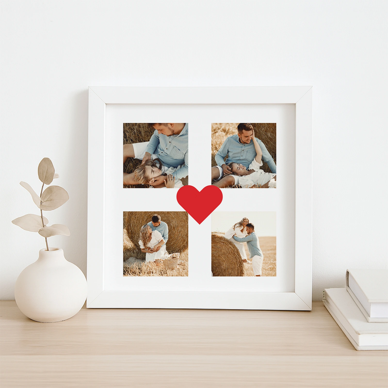 En özel anılarınızı tek bir karede buluşturan bu 25x25 cm ölçüsündeki aşk temalı 4 fotoğraflı kolaj çerçeve, romantik ve zarif tasarımıyla dikkat çeker. Ortasındaki kırmızı kalp detayıyla sevginizi simgelerken, en sevdiğiniz 4 fotoğrafla ilişkinizi ölümsüzleştirmenizi sağlar. Sevgililer günü, yıldönümü veya doğum günü için mükemmel bir hediye alternatifi olan bu çerçeve; hem masa üstünde sergilenebilir, hem de duvara asılarak dekoratif bir görünüm sunar. Sevdiğinize kalpten bir armağan vermek istiyorsanız, bu çerçeve tam size göre!
