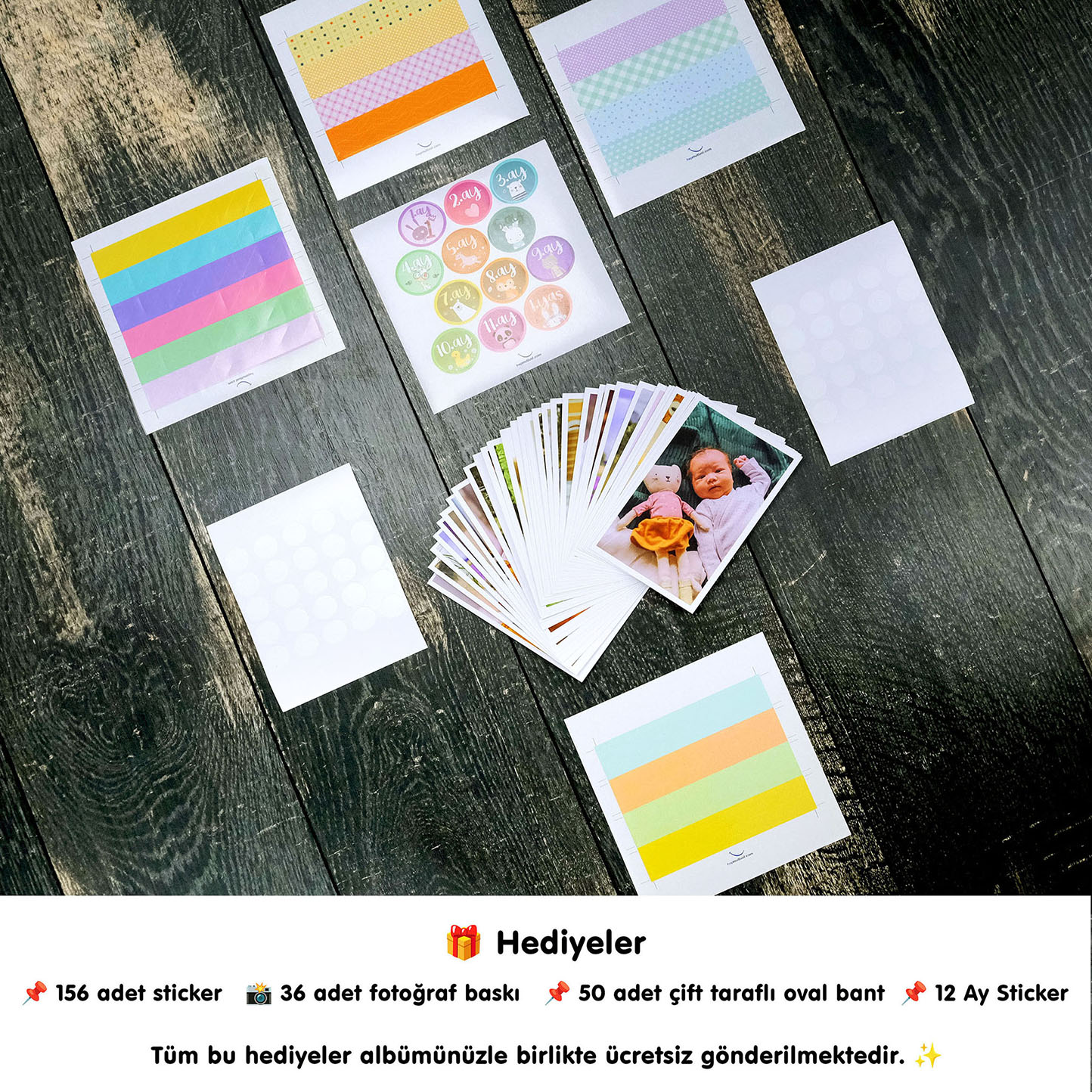 * Albümle birlikte gelen 156 adet sticker, 12 ay konseptli sticker seti ve 50 adet çift taraflı oval bant, anılarınızı kişiselleştirerek yaratıcı bir şekilde düzenlemenize yardımcı olur.