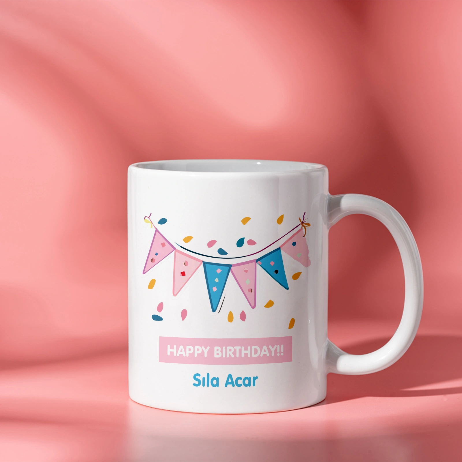 Sevdiklerinizin en mutlu anlarını günlük hayata taşıyın! Özelleştirilmiş fotoğraflı ve isimli doğum günü kupası, hem şık tasarımı hem de kişiye özel hazırlanma imkânı ile unutulmaz bir hediye alternatifi sunar. Ön yüzünde seçeceğiniz fotoğraf, arka yüzünde ise isim yer alır. Renkli grafik detaylar, balon ve süsleme figürleriyle doğum günü havasını yansıtır.