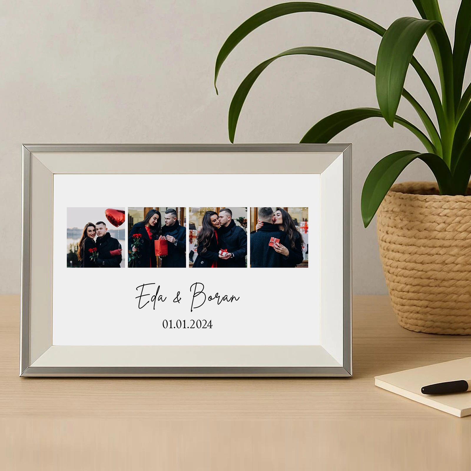 Aşkınızı en özel haliyle yansıtan bu 15x21 cm’lik kişiye özel çerçeve, 4 unutulmaz fotoğrafla birlikte isim ve tarih detayına da yer veriyor. Masa üstü kullanıma uygun bu zarif tasarım; sevgililer günü, yıl dönümü ya da özel bir sürpriz için mükemmel bir hediye seçeneği sunar. Anılarınızı şık bir çerçevede ölümsüzleştirin, sevdiğiniz kişiye her baktığında sizi hatırlatacak romantik bir hatıra bırakın.