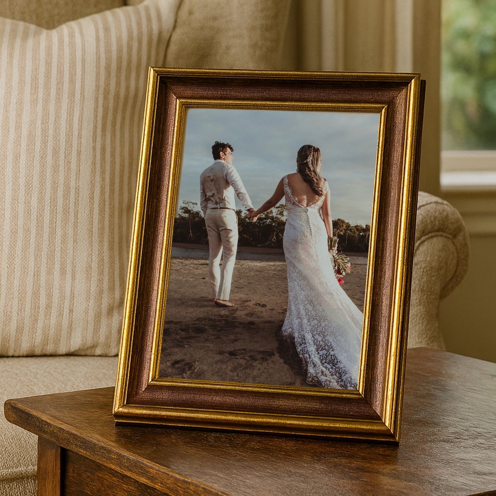 * Sıcak kestane tonları ve zarif altın kenar detaylarıyla klasik bir şıklık sunan bu özel çerçeve, anılarınızı estetik bir şekilde sergilemeniz için tasarlanmıştır.