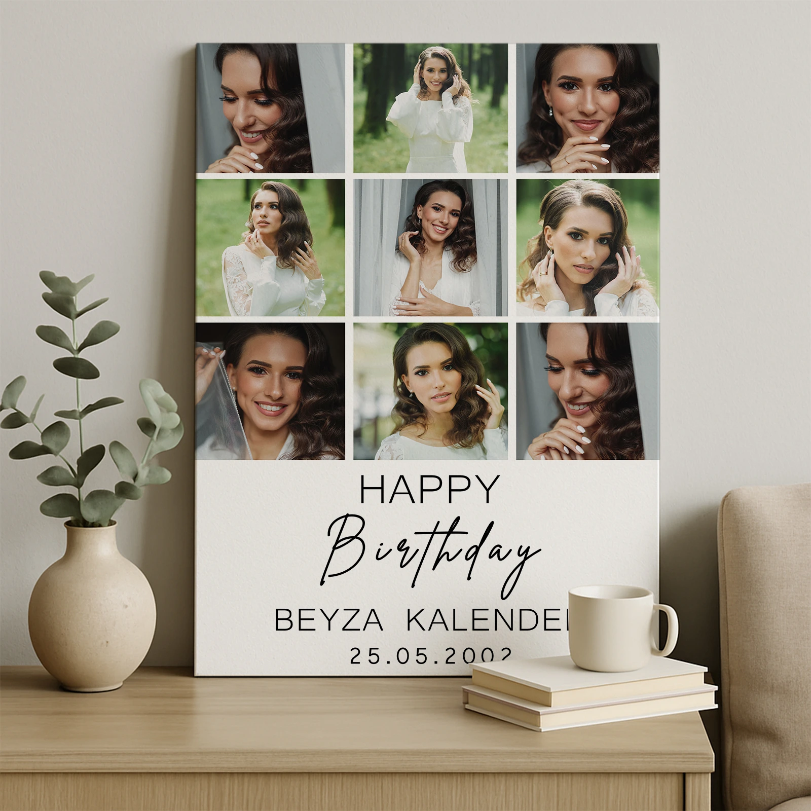 Sevdiklerinize özel, unutulmaz bir doğum günü hediyesi! 9 adet fotoğraf, isim ve tarih detaylarıyla tamamen kişiselleştirilebilen bu 50x70 cm kanvas tablo, hem dekoratif hem de duygusal bir anı niteliği taşıyor.