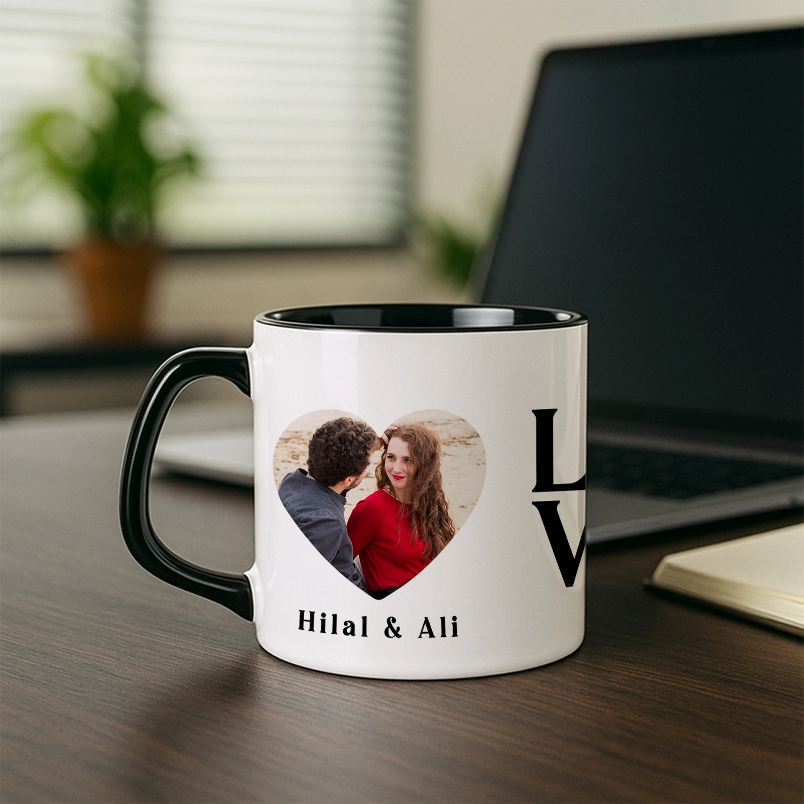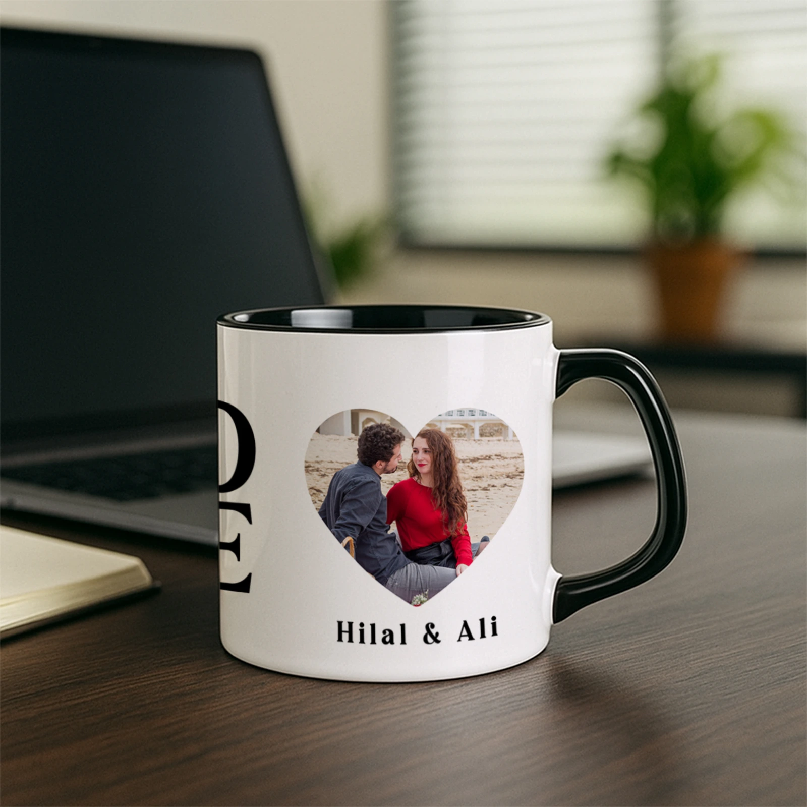 Aşkınızı yansıtan en özel detaylardan biri de bu kupa! Kalp şeklindeki alana yerleştirilen çift fotoğrafınız ve altına eklenen isimleriniz ile tamamen size özel. Kupanın diğer yüzündeki sade ve anlamlı “LOVE” yazısı ise tasarımı tamamlıyor.
