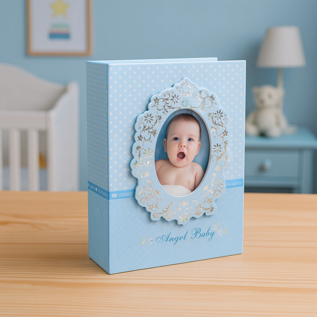 * Şık mavi tasarımı, bebek anılarını nostaljik ve modern bir çizgide bir araya getirir; hem dekoratif hem de duygusal bir hatıra oluşturur.