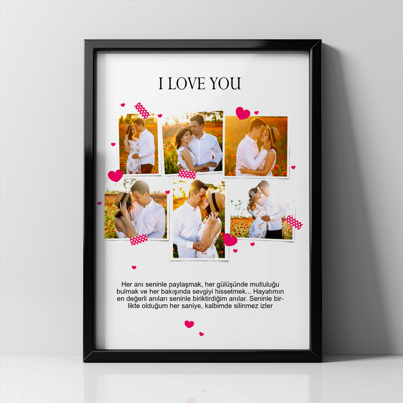 30x40 cm ebatlarındaki bu siyah çerçeve, özel olarak tasarlanmış poster kolaj dizgisi sayesinde altı adet fotoğrafınızı şık bir şekilde sergilemenizi sağlar. Sevgilinize olan duygularınızı ve birlikte geçirdiğiniz özel anları çerçeveleyerek her an göz önünde tutabileceğiniz bu dekoratif ürün, yapışan özelliği sayesinde duvarınıza zarar vermeden kolayca monte edilebilir.