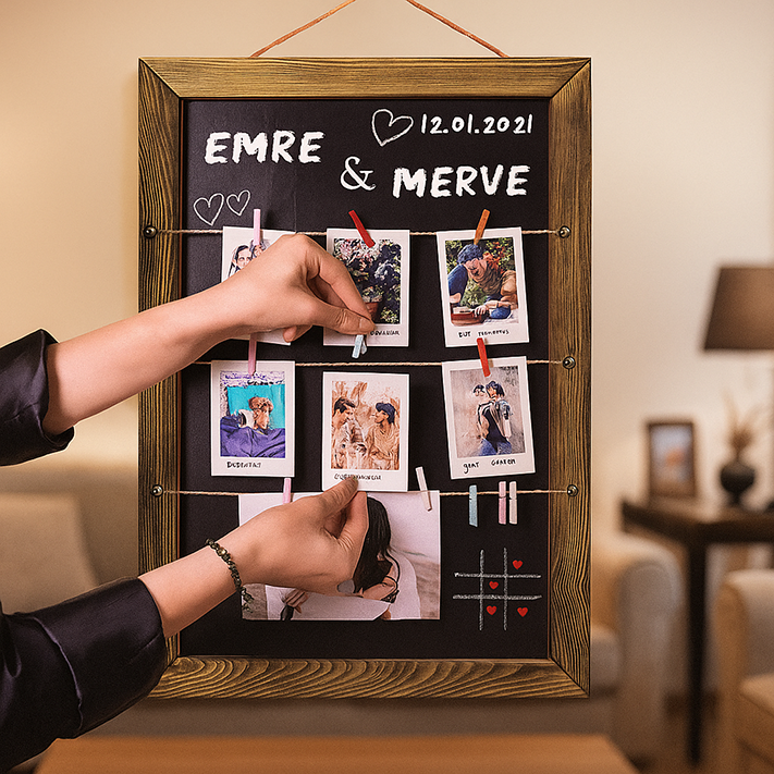 Evinize veya ofisinize hem işlevsel hem de estetik bir dokunuş katmak için mükemmel bir seçenek olan "Yaz-Boz Karatahtalı Ahşap Fotoğraf Çerçevesi - Hasır İpli ve Mandallı", duvar dekorasyonunuza yenilikçi bir yaklaşım getiriyor. Bu çok yönlü çerçeve, anılarınızı sergilemek ve yaratıcılığınızı ifade etmek için ideal bir çözümdür.